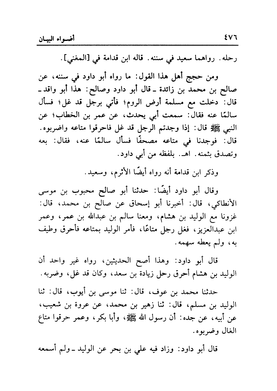 وقال أبو داود أيضًا: حدثنا أبو صالح محبوب بن موسى الأنطاكي، قال: أخبرنا أبو إسحاق عن صالح بن محمد، قال: غزونا مع الوليد بن هشام، ومعنا سالم بن عبد الله بن عمر، وعمر بن عبد العزيز، فغل رجل متاعًا، فأمر الوليد بمتاعه فأحرق وطيف به، ولم يعطه سهمه.
