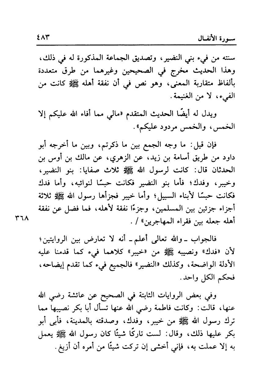 فإن قيل: ما وجه الجمع بين ما ذكرتم، وبين ما أخرجه أبو داود من طريق أسامة بن زيد، عن الزهري، عن مالك بن أوس بن الحدثان قال: كانت لرسول الله صلى الله عليه وسلم ثلاث صفايا: بنو النضير، وخيبر، وفدك؛ فأما بنو النضير فكانت حبسًا لنوائبه، وأما فدك فكانت حبسًا لأبناء السبيل؛ وأما خيبر فجزأها رسول الله صلى الله عليه وسلم ثلاثة أجزاء جزئين بين المسلمين، وجزءًا نفقة لأهله، فما فضل عن نفقة أهله جعله بين فقراء المهاجرين".