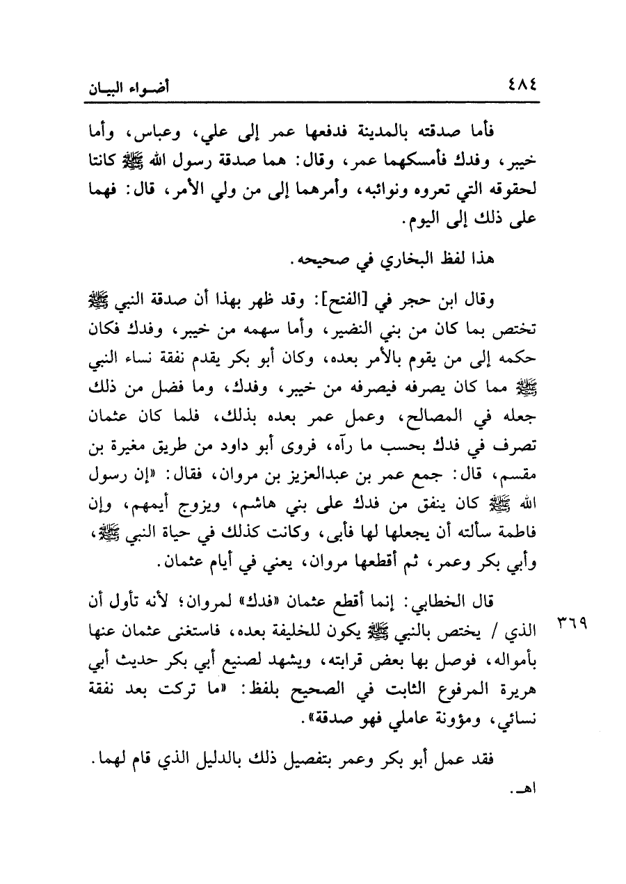 وقال ابن حجر في [الفتح]: وقد ظهر بهذا أن صدقة النبي صلى الله عليه وسلم تختص بما كان من بني النضير، وأما سهمه من خيبر، وفدك فكان حكمه إلى من يقوم بالأمر بعده، وكان أبو بكر يقدم نفقة نساء النبي صلى الله عليه وسلم مما كان يصرفه فيصرفه من خيبر، وفدك، وما فضل من ذلك جعله في المصالح، وعمل عمر بعده بذلك، فلما كان عثمان تصرف في فدك بحسب ما رآه، فروى أبو داود من طريق مغيرة بن مقسم، قال: جمع عمر بن عبد العزيز بن مروان، فقال: "إن رسول الله صلى الله عليه وسلم كان ينفق من فدك علي بني هاشم، ويزوج أيمهم، وإن فاطمة سألته أن يجعلها لها فأبى، وكانت كذلك في حياة النبي صلى الله عليه وسلم ، وأبي بكر وعمر، ثم أقطعها مروان، يعني في أيام عثمان.