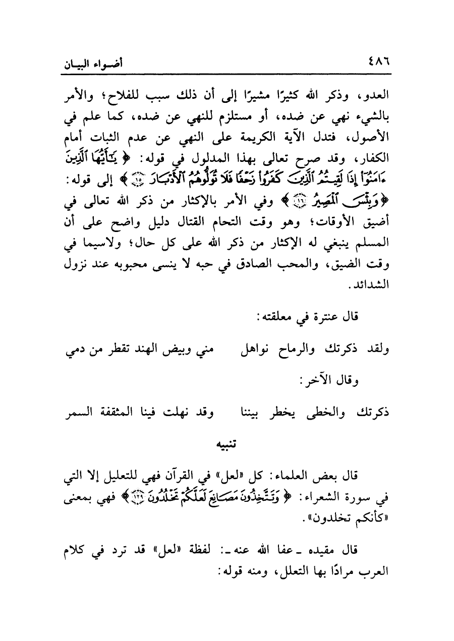 العدو، وذكر الله كثيرًا مشيرًا إلى أن ذلك سبب للفلاح؛ والأمر بالشيء نهي عن ضده، أو مستلزم للنهي عن ضده، كما علم في الأصول، فتدل الآية الكريمة على النهي عن عدم الثبات أمام الكفار، وقد صرح تعالى بهذا المدلول في قوله: {يَا أَيُّهَا الَّذِينَ آمَنُوا إِذَا لَقِيتُمُ الَّذِينَ كَفَرُوا زَحْفًا فَلَا تُوَلُّوهُمُ الْأَدْبَارَ (١٥)} إلى قوله: {وَبِئسَ المْصَيرُ} وفي الأمر بالإكثار من ذكر الله تعالى في أضيق الأوقات؛ وهو وقت التحام القتال دليل واضح على أن المسلم ينبغي له الإكثار من ذكر الله على كل حال؛ ولا سيما في وقت الضيق، والمحب الصادق في حبه لا ينسى محبوبه عند نزول الشدائد.