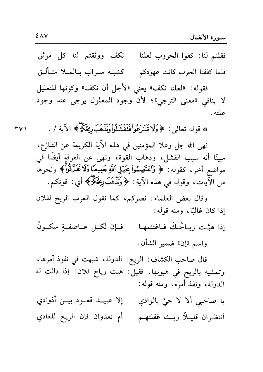 • قوله تعالى: {وَلَا تَنَازَعُوا فَتَفْشَلُوا وَتَذْهَبَ رِيحُكُمْ} الآية.