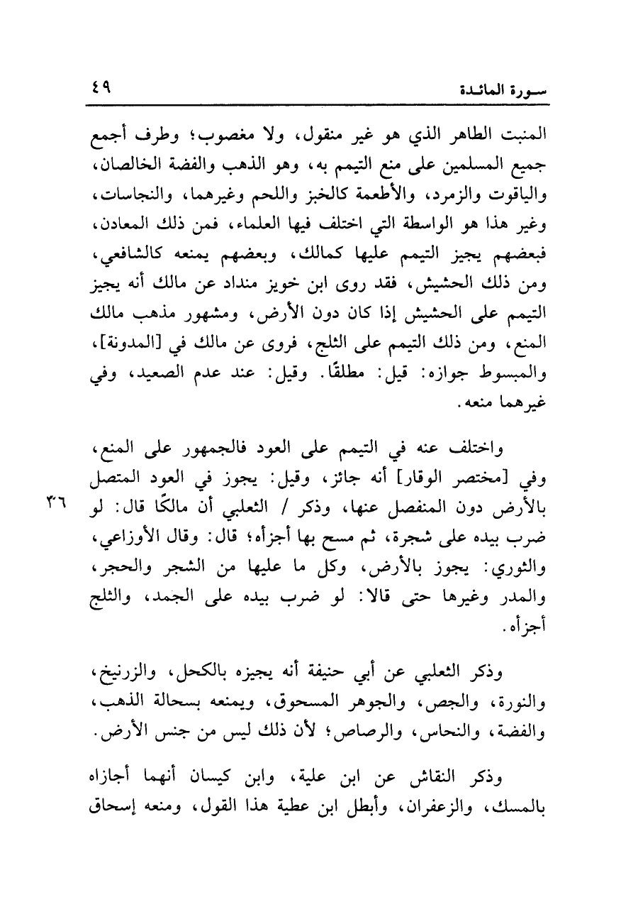 المنبت الطاهر الذي هو غير منقول، ولا مغصوب؛ وطرف أجمع جميع المسلمين على منع التيمم به، وهو الذهب والفضة الخالصان، والياقوت والزمرد، والأطعمة كالخبز واللحم وغيرهما، والنجاسات، وغير هذا هو الواسطة التي اختلف فيها العلماء، فمن ذلك المعادن، فبعضهم يجيز التيمم عليها كمالك، وبعضهم يمنعه كالشافعي، ومن ذلك الحشيش، فقد روى ابن خويز منداد عن مالك أنه يجيز التيمم على الحشيش إذا كان دون الأرض، ومشهور مذهب مالك المنع، ومن ذلك التيمم على الثلج، فروي عن مالك في [المدونة]، والمبسوط جوازه: قيل: مطلقاً. وقيل: عند عدم الصعيد، وفي غيرهما منعه.