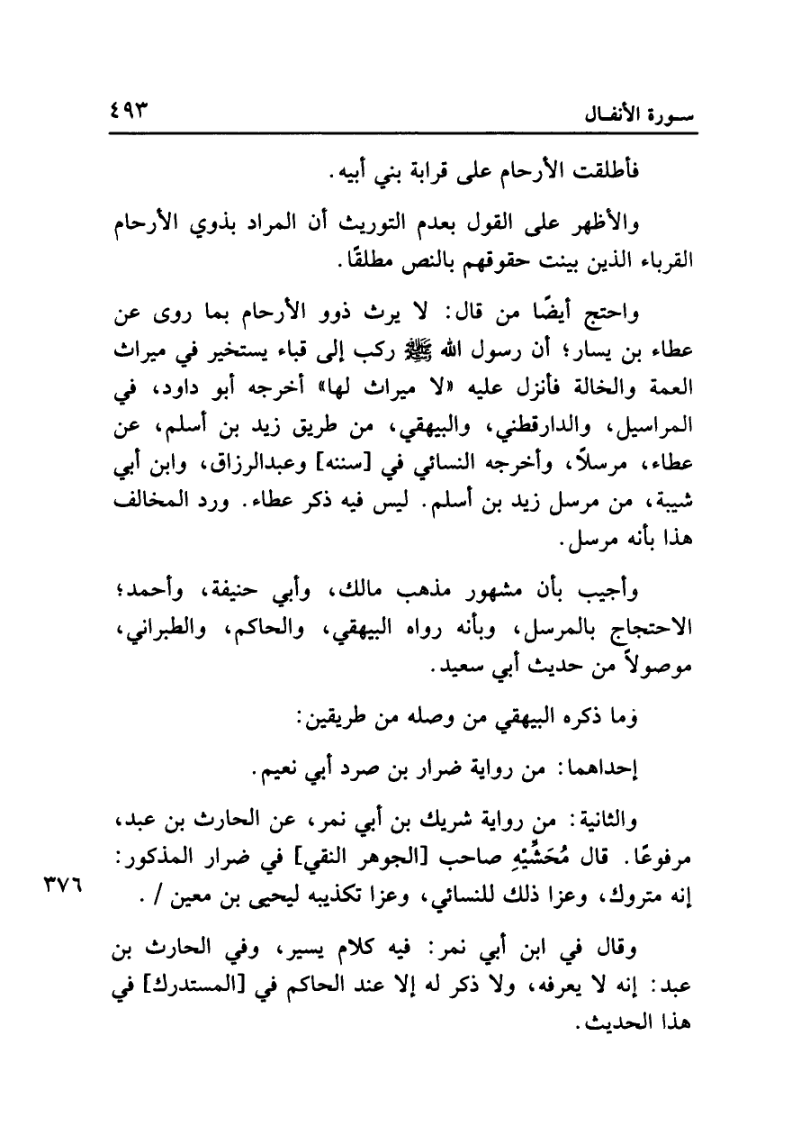 واحتج أيضًا من قال: لا يرث ذوو الأرحام بما روى عن عطاء بن يسار؛ أن رسول الله صلى الله عليه وسلم ركب إلى قباء يستخير في ميراث العمة والخالة فأنزل عليه "لا ميراث لها" أخرجه أبو داود، في المراسيل، والدارقطني، والبيهقي، من طريق زيد بن أسلم، عن عطاء، مرسلًا، وأخرجه النسائي في [سننه] وعبد الرزاق، وابن أبي شيبة، من مرسل زيد بن أسلم. ليس فيه ذكر عطاء. ورد المخالف هذا بأنه مرسل.