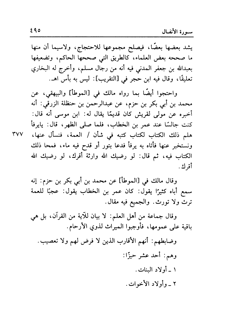 واحتجوا أيضًا بما رواه مالك في [الموطأ] والبيهقي، عن محمد بن أبي بكر بن حزم، عن عبد الرحمن بن حنظلة الزرقي: أنه أخبره عن مولى لقريش كان قديما يقال له: ابن موسى أنه قال: كنت جالسًا عند عمر بن الخطاب، فلما صلى الظهر، قال: يا يرفأ هلم ذلك الكتاب لكتاب كتبه في شأن العمة، فنسأل عنها، ونستخبر عنها فأتاه به يرفأ فدعا بتور أو قدح فيه ماء، فمحا ذلك الكتاب فيه، ثم قال: لو رضيك الله وارثة أقرك، لو رضيك الله أقرك.