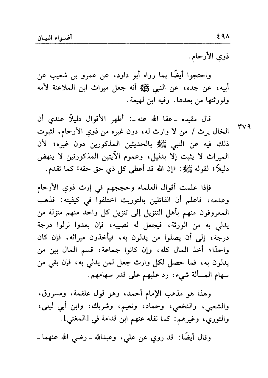 قال مقيده -عفا الله عنه-: أظهر الأقوال دليلًا عندي أن الخال يرث من لا وارث له، دون غيره من ذوي الأرحام، لثبوت ذلك فيه عن النبي صلى الله عليه وسلم بالحديثين المذكورين دون غيره؛ لأن الميراث لا يثبت إلا بدليل، وعموم الآيتين المذكورتين لا ينهض دليلًا؛ لقوله صلى الله عليه وسلم : "إن الله قد أعطى كل ذي حق حقه" كما تقدم.