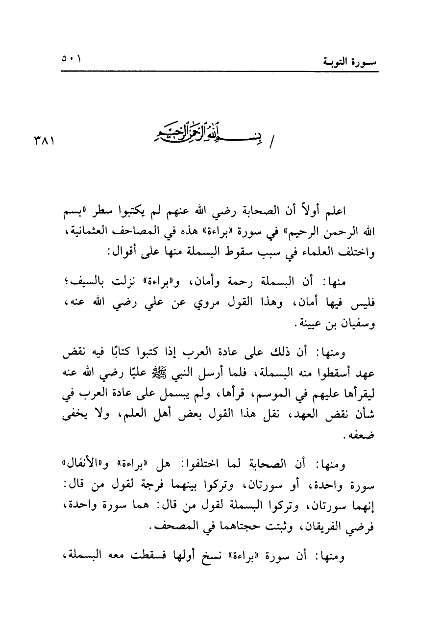 ومنها: أن ذلك على عادة العرب إذا كتبوا كتابًا فيه نقض عهد أسقطوا منه البسملة، فلما أرسل النبي - صلى الله عليه وسلم - عليًّا رضي الله عنه ليقرأها عليهم في الموسم، قرأها، ولم يبسمل على عادة العرب في شأن نقض العهد، نقل هذا القول بعض أهل العلم، ولا يخفى ضعفه.