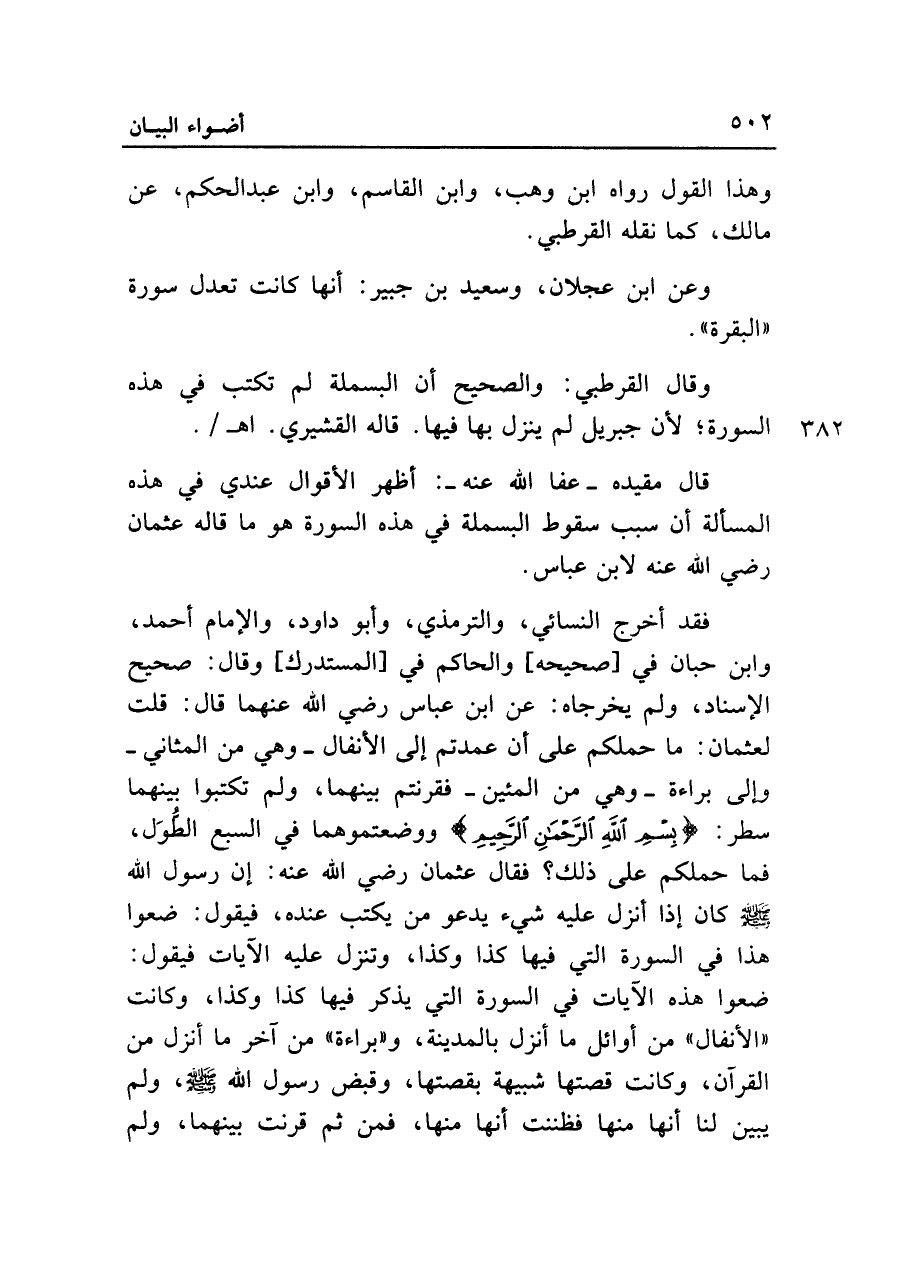 قال مقيده - عفا الله عنه -: أظهر الأقوال عندي في هذه المسألة أن سبب سقوط البسملة في هذه السورة هو ما قاله عثمان رضي الله عنه لابن عباس.