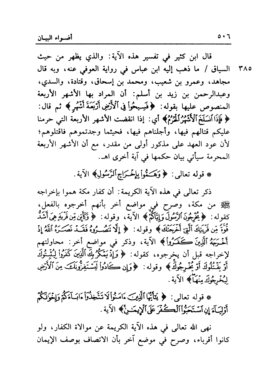 • قوله تعالى: {يَا أَيُّهَا الَّذِينَ آمَنُوا لَا تَتَّخِذُوا آبَاءَكُمْ وَإِخْوَانَكُمْ أَوْلِيَاءَ إِنِ اسْتَحَبُّوا الْكُفْرَ عَلَى الْإِيمَانِ} الآية.