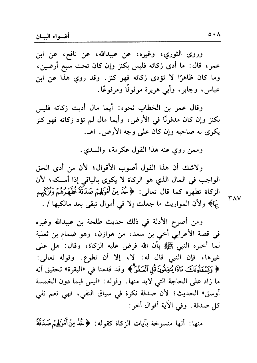 ولا شك أن هذا القول أصوب الأقوال؛ لأن من أدى الحق الواجب في المال الذي هو الزكاة لا يكوى بالباقي إذا أمسكه؛ لأن الزكاة تطهره كما قال تعالى: {خُذْ مِنْ أَمْوَالِهِمْ صَدَقَةً تُطَهِّرُهُمْ وَتُزَكِّيهِمْ بِهَا} ولأن المواريث ما جعلت إلا في أموال تبقى بعد مالكيها.