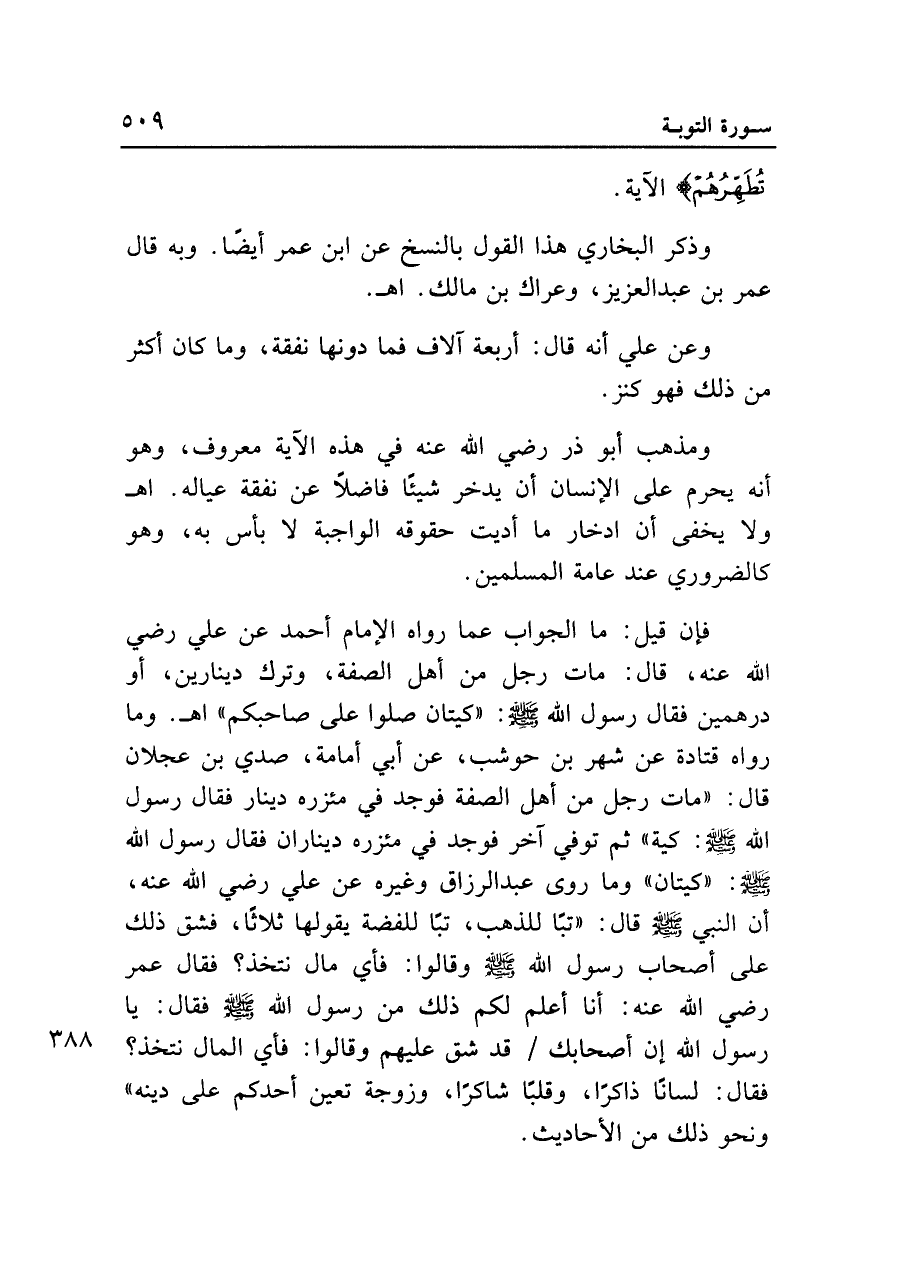 فإن قيل: ما الجواب عما رواه الإمام أحمد عن علي رضي الله عنه، قال: مات رجل من أهل الصفة، وترك دينارين، أو درهمين فقال رسول الله - صلى الله عليه وسلم -: "كيتان صلوا على صاحبكم" اهـ. وما رواه قتادة عن شهر بن حوشب، عن أبي أمامة، صدي بن عجلان قال: "مات رجل من أهل الصفة فوجد في مئزره دينار فقال رسول الله - صلى الله عليه وسلم -: كية" ثم توفي آخر فوجد في مئزره ديناران فقال رسول الله - صلى الله عليه وسلم -: "كيتان" وما روى عبد الرزاق وغيره عن علي رضي الله عنه، أن النبي - صلى الله عليه وسلم - قال: "تبًا للذهب، تبًا للفضة يقولها ثلاثًا، فشق ذلك على أصحاب رسول الله - صلى الله عليه وسلم - وقالوا: فأي مال نتخذ؟ فقال عمر رضي الله عنه: أنا أعلم لكم ذلك من رسول الله - صلى الله عليه وسلم - فقال: يا رسول الله إن أصحابك قد شق عليهم وقالوا: فأي المال نتخذ؟ فقال: لسانًا ذاكرًا، وقلبًا شاكرًا، وزوجة تعين أحدكم على دينه" ونحو ذلك من الأحاديث.