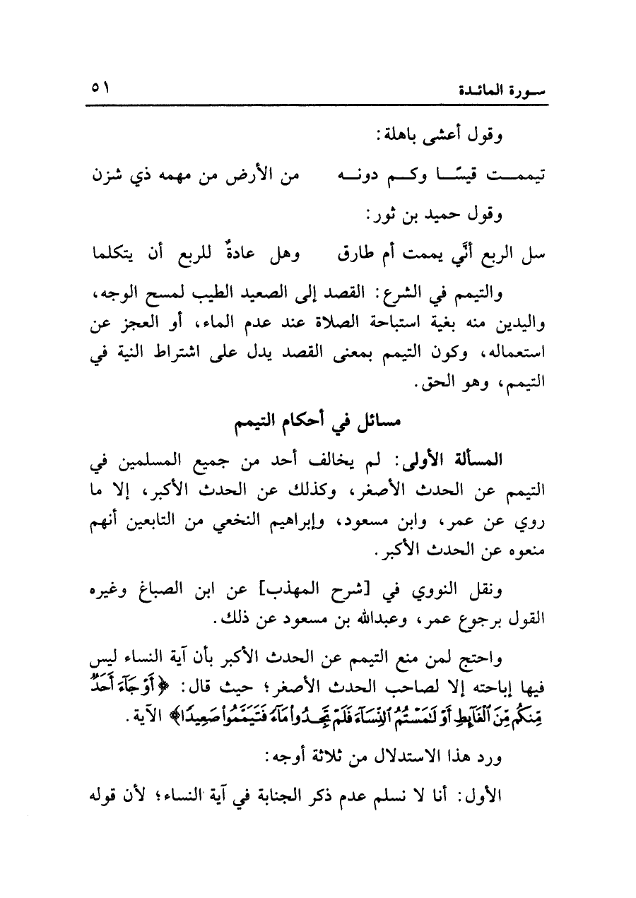 واحتج لمن منع التيمم عن الحدث الأكبر بأن آية النساء ليس فيها إباحته إلا لصاحب الحدث الأصغر؛ حيث قال: {أَوْ جَاءَ أَحَدٌ مِنْكُمْ مِنَ الْغَائِطِ أَوْ لامَسْتُمُ النساء فَلَمْ تَجِدُوا مَاءً فَتَيَمَّمُوا صَعِيداً} الآية.