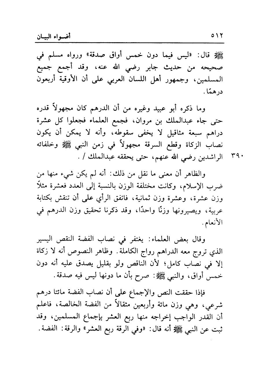 فإذا حققت النص والإجماع على أن نصاب الفضة مائتا درهم شرعي، وهي وزن مائة وأربعين مثقالًا من الفضة الخالصة، فاعلم أن القدر الواجب إخراجه منها ربع العشر بإجماع المسلمين، وقد ثبت عن النبي - صلى الله عليه وسلم - أنه قال: "وفي الرقة ربع العشر" والرقة: الفضة.