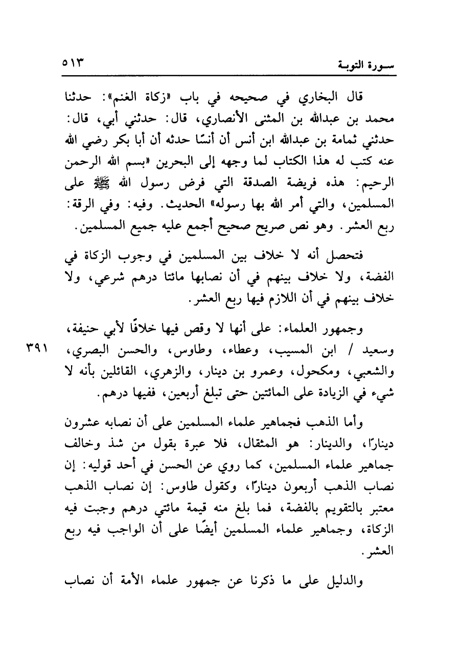 قال البخاري في صحيحه في باب "زكاة الغنم": حدثنا محمد بن عبد الله بن المثنى الأنصاري، قال: حدثني أبي، قال: حدثني ثمامة بن عبد الله ابن أنس أن أنسًا حدثه أن أبا بكر رضي الله عنه كتب له هذا الكتاب لما وجهه إلى البحرين "بِسْمِ اللَّهِ الرَّحْمَنِ الرَّحِيمِ: هذه فريضة الصدقة التي فرض رسول الله - صلى الله عليه وسلم - على المسلمين، والتي أمر الله بها رسوله" الحديث. وفيه: وفي الرقة: ربع العشر. وهو نص صريح صحيح أجمع عليه جميع المسلمين.