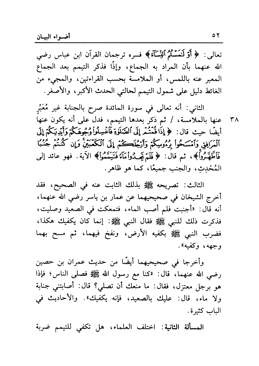 الثاني: أنه تعالى في سورة المائدة صرح بالجنابة غير معبر عنها بالملامسة، ثم ذكر بعدها التيمم، فدل على أنه يكون عنها أيضاً حيث قال: {إِذَا قُمْتُمْ إِلَى الصَّلاةِ فَاغْسِلُوا وُجُوهَكُمْ وَأَيْدِيَكُمْ إِلَى الْمَرَافِقِ وَامْسَحُوا بِرُءُوسِكُمْ وَأَرْجُلَكُمْ إِلَى الْكَعْبَيْنِ وَإِنْ كُنْتُمْ جُنُباً فَاطَّهَّرُوا} ثم قال: {فَلَمْ تَجِدُوا مَاءً فَتَيَمَّمُوا} الآية. فهو عائد إلى المحدث، والجنب جميعاً، كما هو ظاهر.