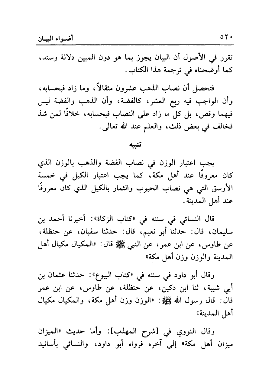 قال النسائي في سننه في "كتاب الزكاة": أخبرنا أحمد بن سليمان، قال: حدثنا أبو نعيم، قال: حدثنا سفيان، عن حنظلة، عن طاوس، عن ابن عمر، عن النبي - صلى الله عليه وسلم - قال: "المكيال مكيال أهل المدينة والوزن وزن أهل مكة".
