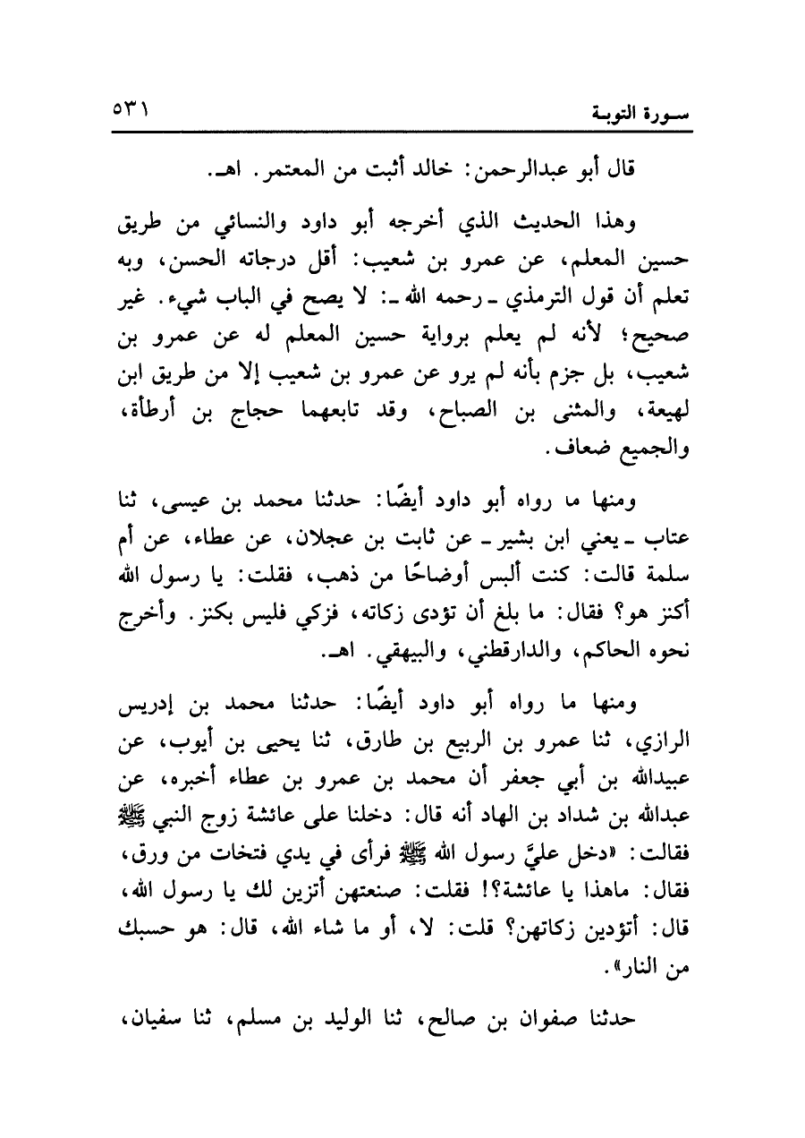 وهذا الحديث الذي أخرجه أبو داود والنسائي من طريق حسين المعلم، عن عمرو بن شعيب: أقل درجاته الحسن، وبه تعلم أن قول الترمذي -رحمه الله-: لا يصح في الباب شيء. غير صحيح؛ لأنه لم يعلم برواية حسين المعلم له عن عمرو بن شعيب، بل جزم بأنه لم يرو عن عمرو بن شعيب إلا من طريق ابن لهيعة، والمثنى بن الصباح، وقد تابعهما حجاج بن أرطأة، والجميع ضعاف.