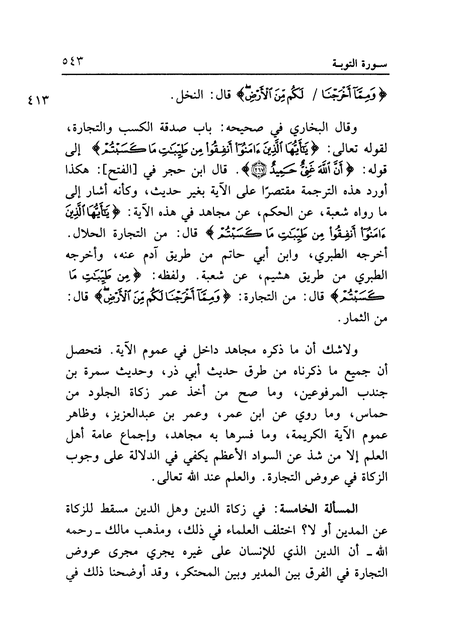 وقال البخاري في صحيحه: باب صدقة الكسب والتجارة، لقوله تعالى: {يَا أَيُّهَا الَّذِينَ آمَنُوا أَنْفِقُوا مِنْ طَيِّبَاتِ مَا كَسَبْتُمْ} إلى قوله: {أَنَّ اللَّهَ غَنِيٌّ حَمِيدٌ (٢٦٧)}. قال ابن حجر في [الفتح]: هكذا أورد هذه الترجمة مقتصرًا على الآية بغير حديث، وكأنه أشار إلى ما رواه شعبة، عن الحكم، عن مجاهد في هذه الآية: {يَا أَيُّهَا الَّذِينَ آمَنُوا أَنْفِقُوا مِنْ طَيِّبَاتِ مَا كَسَبْتُمْ} قال: من التجارة الحلال. أخرجه الطبري، وابن أبي حاتم من طريق آدم عنه، وأخرجه الطبري من طريق هشيم، عن شعبة. ولفظه: {مِنْ طَيِّبَاتِ مَا كَسَبْتُمْ} قال: من التجارة: {وَمِمَّا أَخْرَجْنَا لَكُمْ مِنَ الْأَرْضِ} قال: من الثمار.