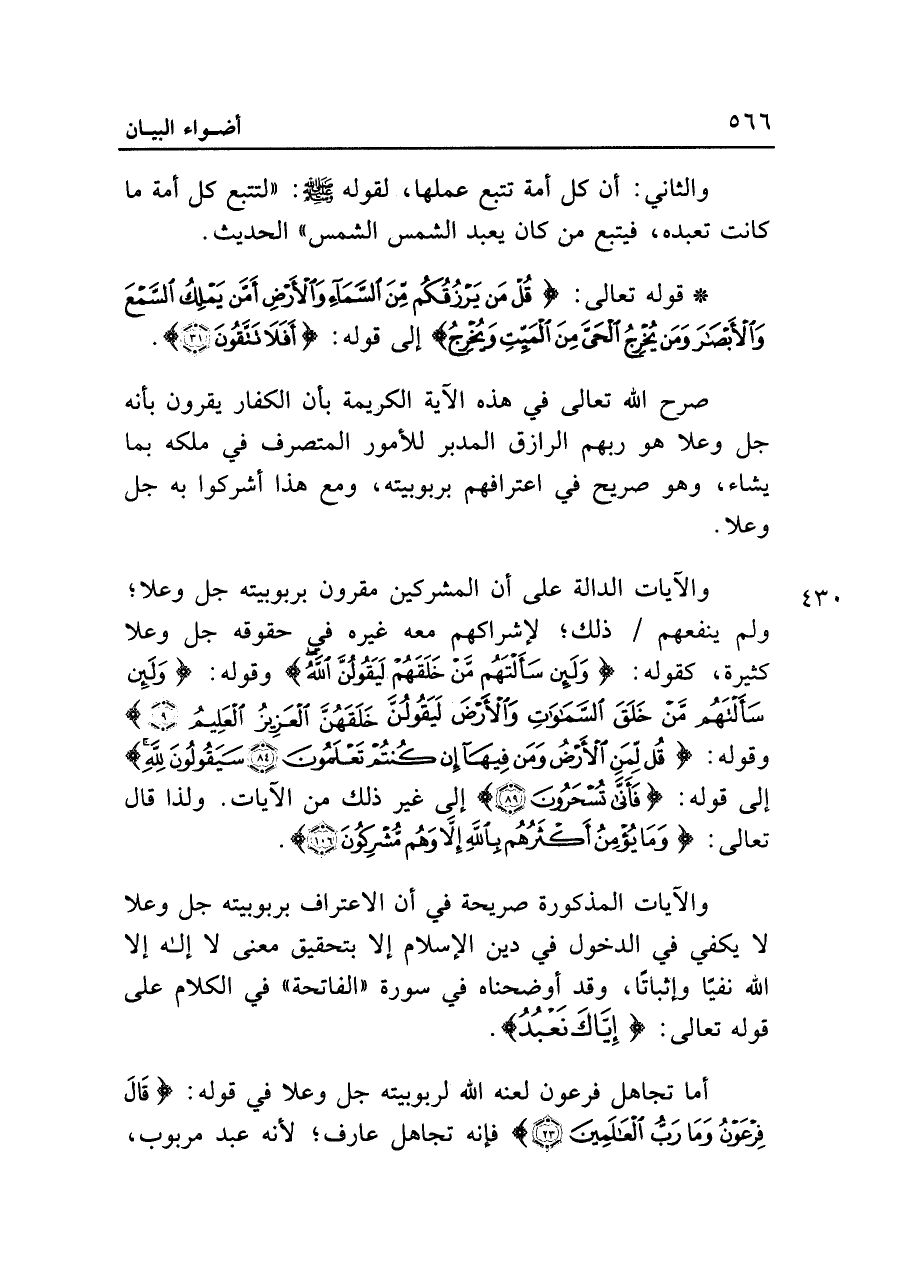 والآيات المذكورة صريحة في أن الاعتراف بربوبيته جل وعلا لا يكفي في الدخول في دين الإسلام إلا بتحقيق معنى لا إله إلا الله نفيا وإثباتًا، وقد أوضحناه في سورة "الفاتحة" في الكلام على قوله تعالى: {إِيَّاكَ نَعْبُدُ}.