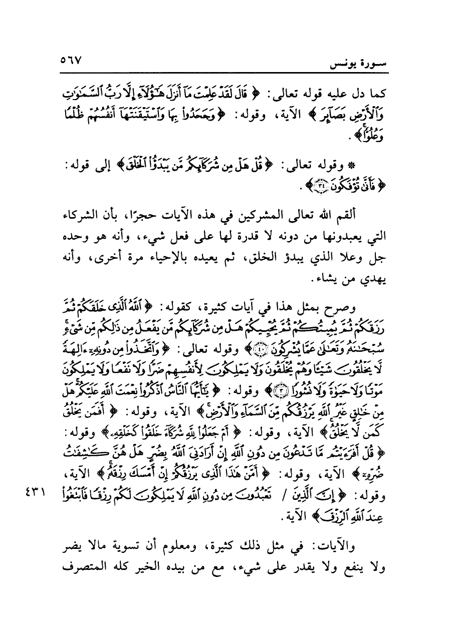 • وقوله تعالى: {قُلْ هَلْ مِنْ شُرَكَائِكُمْ مَنْ يَبْدَأُ الْخَلْقَ} إلى قوله: {فَأَنَّى تُؤْفَكُونَ (٣٤)}.
