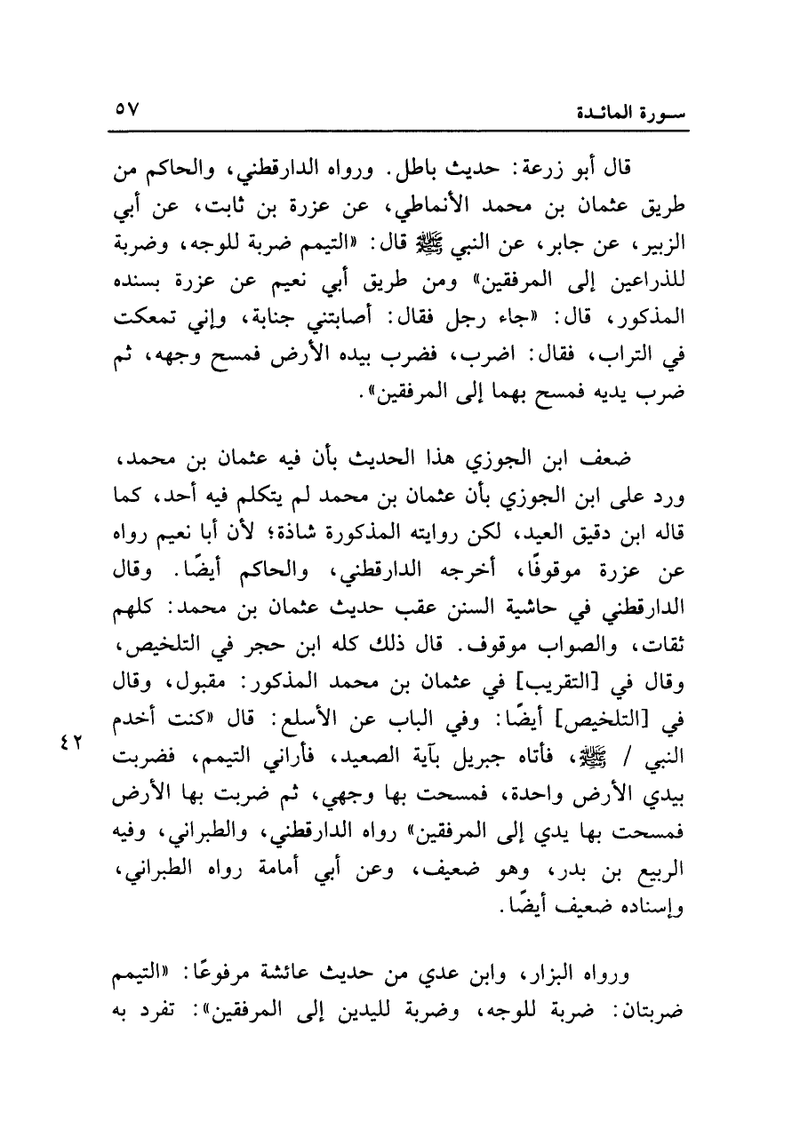 ضعف ابن الجوزي هذا الحديث بأن فيه عثمان بن محمد، ورد على ابن الجوزي بأن عثمان بن محمد لم يتكلم فيه أحد، كما قاله ابن دقيق العيد، لكن روايته المذكورة شاذة؛ لأن أبا نعيم رواه عن عزرة موقوفاً، أخرجه الدارقطني، والحاكم أيضاً. وقال الدارقطني في حاشية السنن عقب حديث عثمان بن محمد: كلهم ثقات، والصواب موقوف. قال ذلك كله ابن حجر في التلخيص، وقال في [التقريب] في عثمان بن محمد المذكور: مقبول، وقال في [التلخيص] أيضاً: وفي الباب عن الأسلع: قال "كنت أخدم النبي - صلى الله عليه وسلم -، فأتاه جبريل بآية الصعيد، فأراني التيمم، فضربت بيدي الأرض واحدة، فمسحت بها وجهي، ثم ضربت بها الأرض فمسحت بها يدي إلى المرفقين" رواه الدارقطني، والطبراني، وفيه الربيع بن بدر، وهو ضعيف، وعن أبي أمامة رواه الطبراني، وإسناده ضعيف أيضاً.