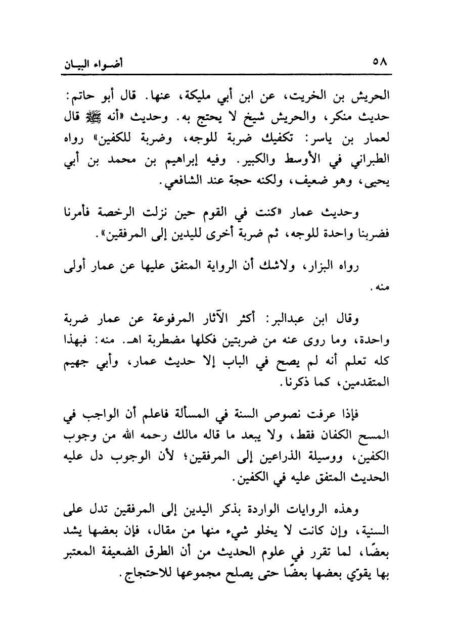 وقال ابن عبد البر: أكثر الآثار المرفوعة عن عمار ضربة واحدة، وما روي عنه من ضربتين فكلها مضطربة اهـ. منه: فبهذا كله تعلم أنه لم يصح في الباب إلا حديث عمار، وأبي جهيم المتقدمين، كما ذكرنا.