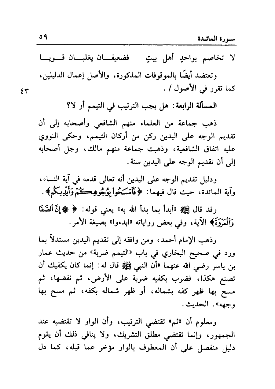 ودليل تقديم الوجه على اليدين أنه تعالى قدمه في آية النساء، وآية المائدة، حيث قال فيهما: {فَامْسَحُوا بِوُجُوهِكُمْ وَأَيْدِيكُمْ}.