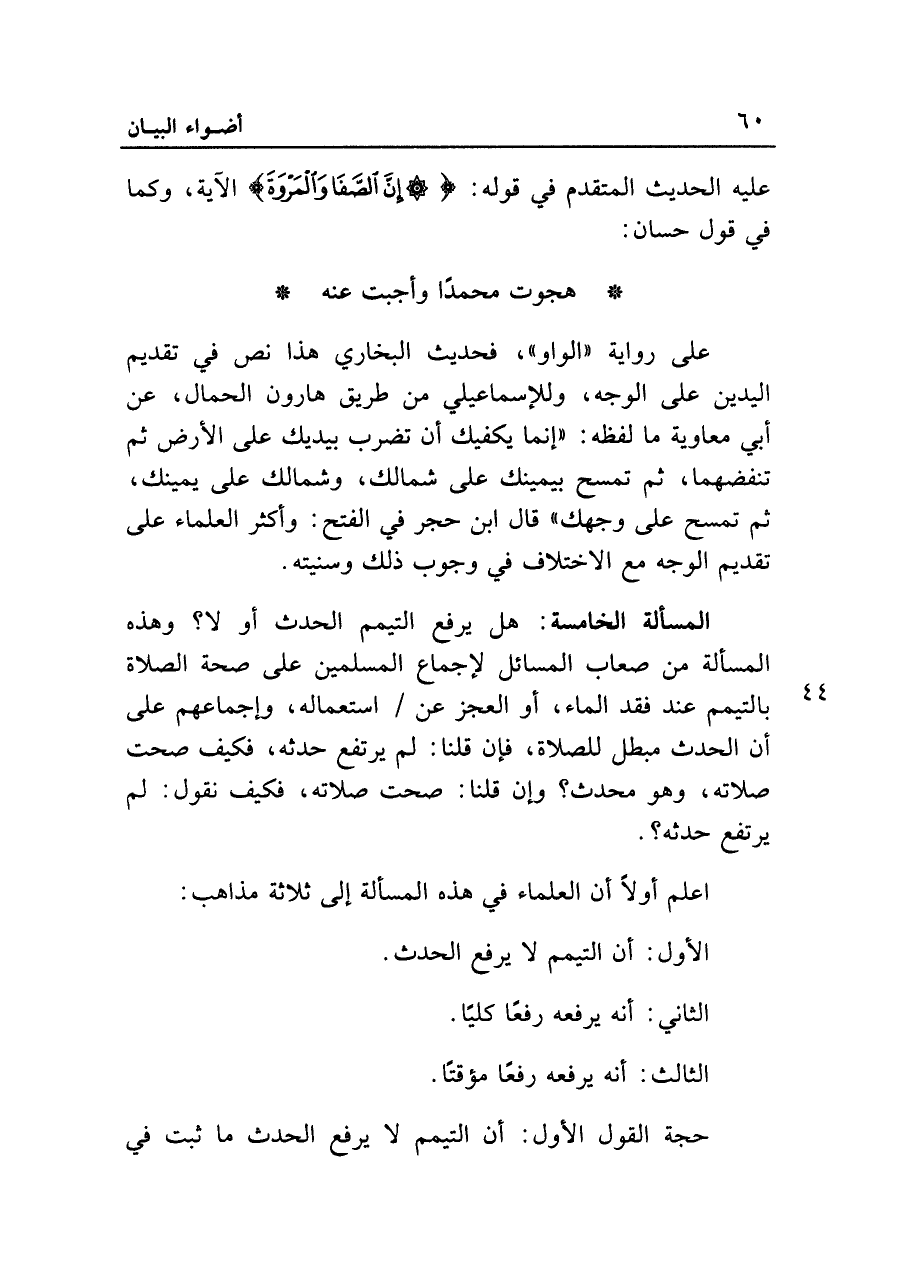 المسألة الخامسة: هل يرفع التيمم الحدث أو لا؟ وهذه المسألة من صعاب المسائل لإجماع المسلمين على صحة الصلاة بالتيمم عند فقد الماء، أو العجز عن استعماله، وإجماعهم على أن الحدث مبطل للصلاة، فإن قلنا: لم يرتفع حدثه، فكيف صحت صلاته، وهو محدث؟ وإن قلنا: صحت صلاته، فكيف نقول: لم يرتفع حدثه؟.