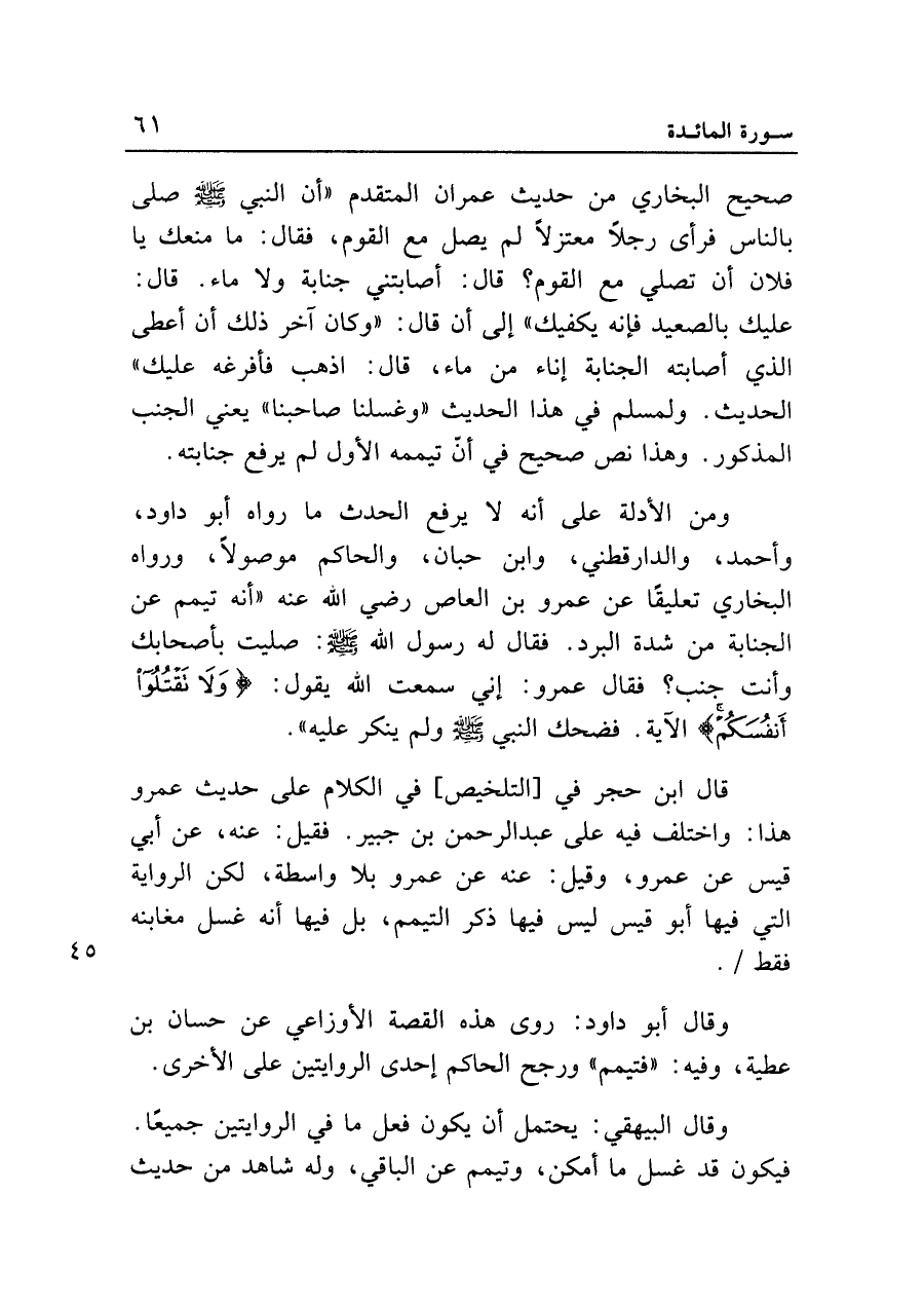 ومن الأدلة على أنه لا يرفع الحدث ما رواه أبو داود، وأحمد، والدارقطني، وابن حبان، والحاكم موصولاً، ورواه البخاري تعليقاً عن عمرو بن العاص رضي الله عنه "أنه تيمم عن الجنابة من شدة البرد. فقال له رسول الله - صلى الله عليه وسلم -: صليت بأصحابك وأنت جنب؟ فقال عمرو: إني سمعت الله يقول: {وَلا تَقْتُلُوا أَنْفُسَكُمْ} الآية. فضحك النبي - صلى الله عليه وسلم - ولم ينكر عليه".