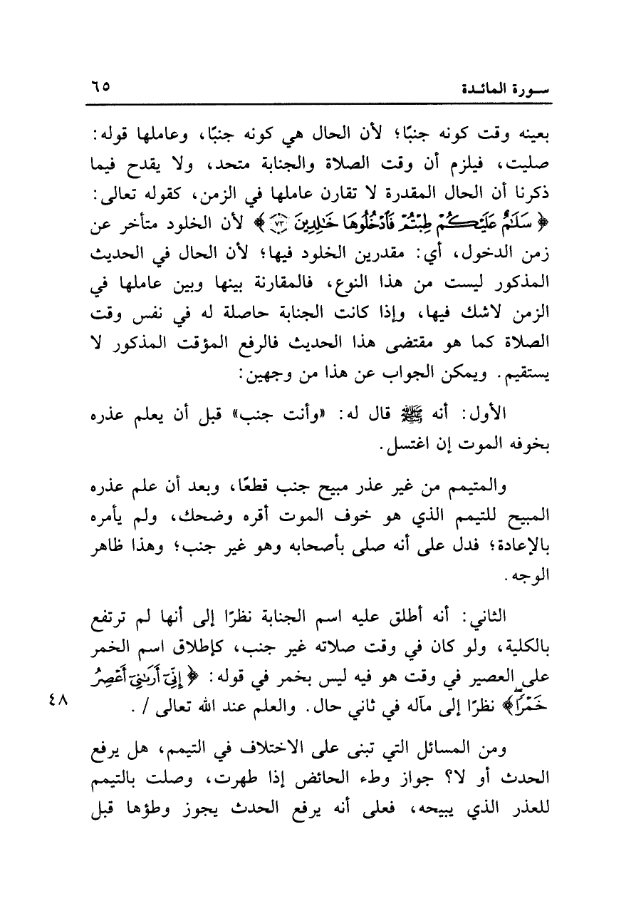الثاني: أنه أطلق عليه اسم الجنابة نظراً إلى أنها لم ترتفع بالكلية، ولو كان في وقت صلاته غير جنب، كإطلاق اسم الخمر على العصير في وقت هو فيه ليس بخمر في قوله: {إِنِّي أَرَانِي أَعْصِرُ خَمْراً} نظراً إلى مآله في ثاني حال. والعلم عند الله تعالى.