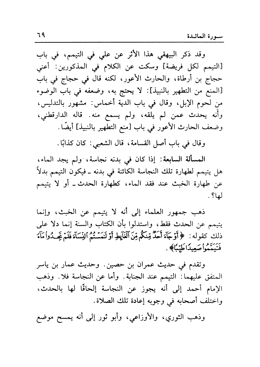 وقد ذكر البيهقي هذا الأثر عن علي في التيمم، في باب [التيمم لكل فريضة] وسكت عن الكلام في المذكورين: أعني حجاج بن أرطاة، والحارث الأعور، لكنه قال في حجاج في باب [المنع من التطهير بالنبيذ]: لا يحتج به، وضعفه في باب الوضوء من لحوم الإبل، وقال في باب الدية أخماس: مشهور بالتدليس، وأنه يحدث عمن لم يلقه، ولم يسمع منه. قاله الدارقطني، وضعف الحارث الأعور في باب [منع التطهير بالنبيذ] أيضاً.