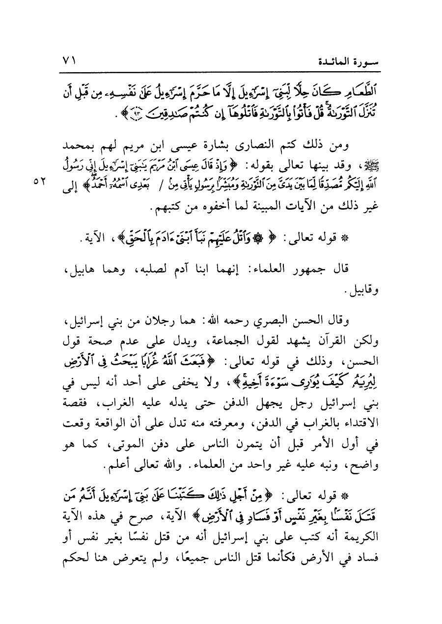 • قوله تعالى: {* وَاتْلُ عَلَيْهِمْ نَبَأَ ابْنَيْ آدَمَ بِالْحَقِّ}، الآية.