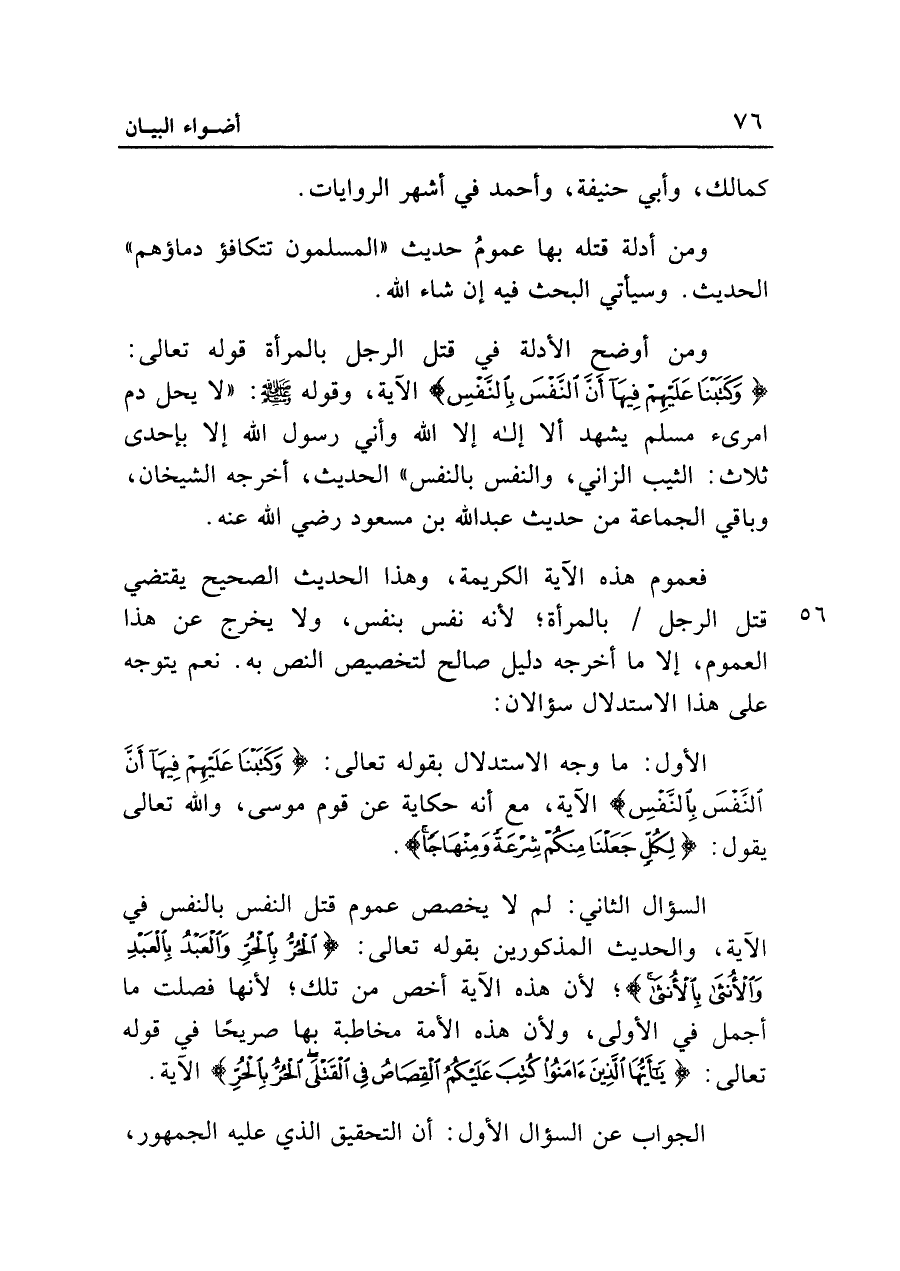فعموم هذه الآية الكريمة، وهذا الحديث الصحيح يقتضي قتل الرجل بالمرأة؛ لأنه نفس بنفس، ولا يخرج عن هذا العموم، إلا ما أخرجه دليل صالح لتخصيص النص به. نعم يتوجه على هذا الاستدلال سؤالان: