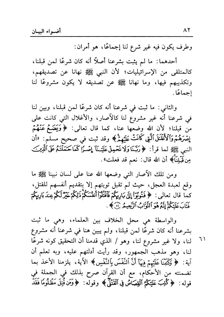والواسطة هي محل الخلاف بين العلماء، وهي ما ثبت بشرعنا أنه كان شرعاً لمن قبلنا، ولم يبين هنا في شرعنا أنه مشروع لنا، ولا غير مشروع لنا، وهو الذي قدمنا أن التحقيق كونه شرعاً لنا، وهو مذهب الجمهور، وقد رأيت أدلتهم عليه، وبه تعلم أن آية: {وَكَتَبْنَا عَلَيْهِمْ فِيهَا أَنَّ النَّفْسَ بِالنَّفْسِ} الآية، يلزمنا الأخذ بما تضمنته من الأحكام، مع أن القرآن صرح بذلك في الجملة في قوله: {كُتِبَ عَلَيْكُمُ الْقِصَاصُ فِي الْقَتْلَى} وقوله: {وَمَنْ قُتِلَ مَظْلُوماً فَقَدْ