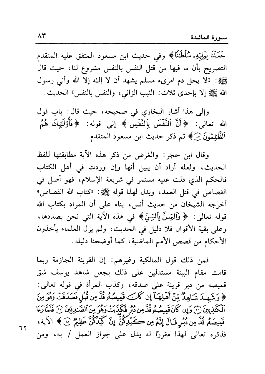 جَعَلْنَا لِوَلِيِّهِ سُلْطَاناً} وفي حديث ابن مسعود المتفق عليه المتقدم التصريح بأن ما فيها من قتل النفس بالنفس مشروع لنا، حيث قال - صلى الله عليه وسلم -: "لا يحل دم امرئ مسلم يشهد أن لا إله إلا الله وأني رسول الله - صلى الله عليه وسلم - إلا بإحدى ثلاث: الثيب الزاني، والنفس بالنفس" الحديث.