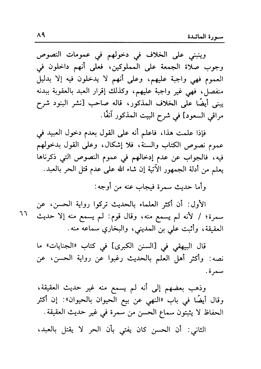 وذهب بعضهم إلى أنه لم يسمع منه غير حديث العقيقة، وقال أيضاً في باب "النهي عن بيع الحيوان بالحيوان": إن أكثر الحفاظ لا يثبتون سماع الحسن من سمرة في غير حديث العقيقة.