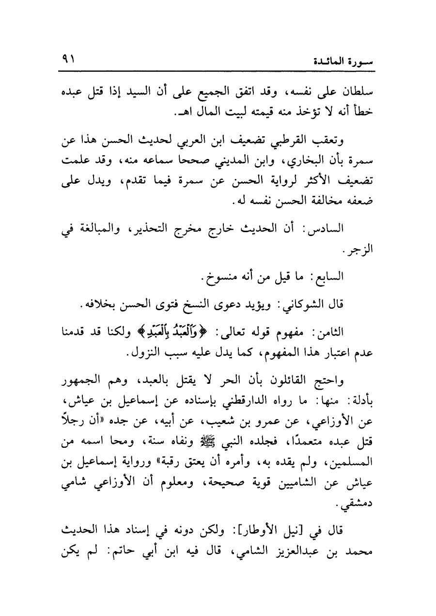 واحتج القائلون بأن الحر لا يقتل بالعبد، وهم الجمهور بأدلة: منها: ما رواه الدارقطني بإسناده عن إسماعيل بن عياش، عن الأوزاعي، عن عمرو بن شعيب، عن أبيه، عن جده "أن رجلاً قتل عبده متعمداً، فجلده النبي - صلى الله عليه وسلم - ونفاه سنة، ومحا اسمه من المسلمين، ولم يقده به، وأمره أن يعتق رقبة" ورواية إسماعيل بن عياش عن الشاميين قوية صحيحة، ومعلوم أن الأوزاعي شامي دمشقي.