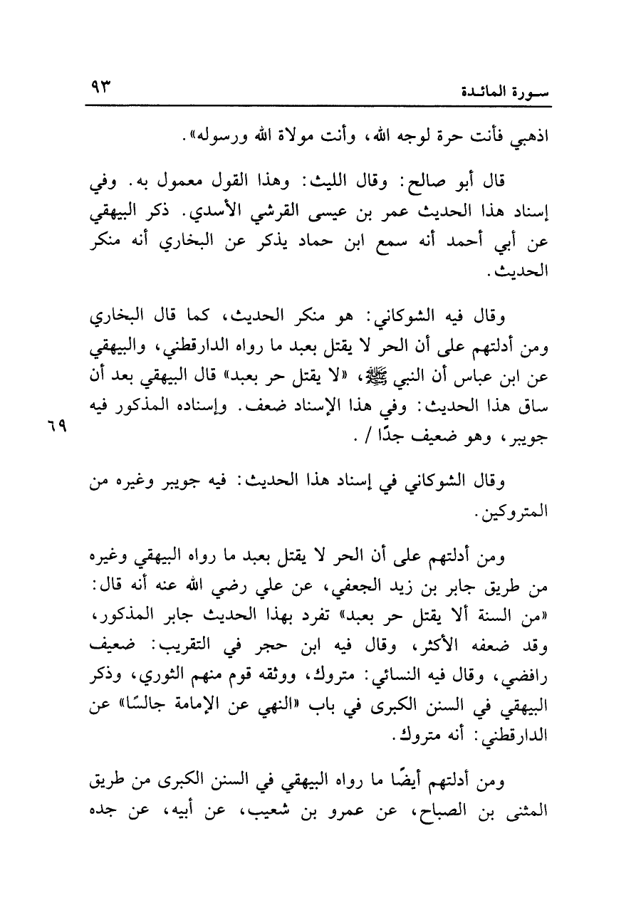 وقال فيه الشوكاني: هو منكر الحديث، كما قال البخاري ومن أدلتهم على أن الحر لا يقتل بعبد ما رواه الدارقطني، والبيهقي عن ابن عباس أن النبي - صلى الله عليه وسلم -، "لا يقتل حر بعبد" قال البيهقي بعد أن ساق هذا الحديث: وفي هذا الإسناد ضعف. وإسناده المذكور فيه جويبر، وهو ضعيف جداً.