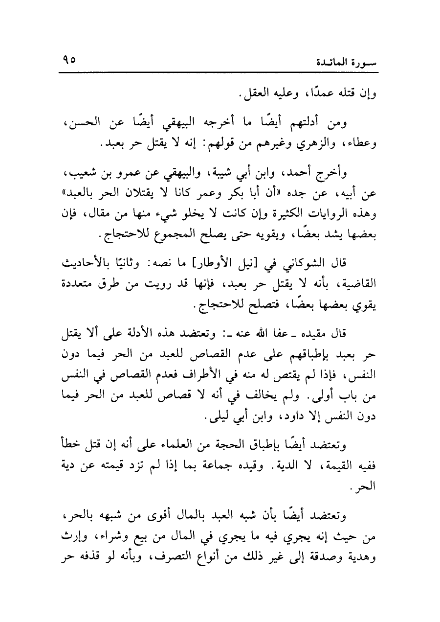 وأخرج أحمد، وابن أبي شيبة، والبيهقي عن عمرو بن شعيب، عن أبيه، عن جده "أن أبا بكر وعمر كانا لا يقتلان الحر بالعبد" وهذه الروايات الكثيرة وإن كانت لا يخلو شيء منها من مقال، فإن بعضها يشد بعضاً، ويقويه حتى يصلح المجموع للاحتجاج.