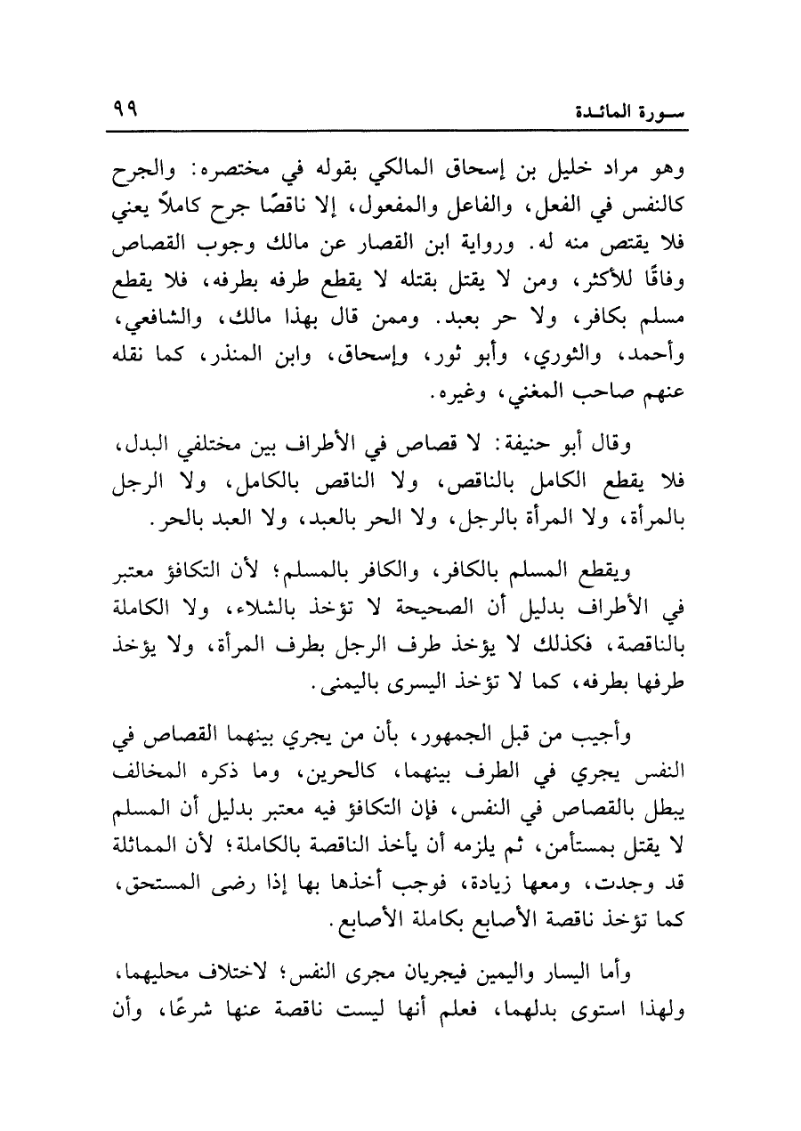 وهو مراد خليل بن إسحاق المالكي بقوله في مختصره: والجرح كالنفس في الفعل، والفاعل والمفعول، إلا ناقصاً جرح كاملاً يعني فلا يقتص منه له. ورواية ابن القصار عن مالك وجوب القصاص وفاقاً للأكثر، ومن لا يقتل بقتله لا يقطع طرفه بطرفه، فلا يقطع مسلم بكافر، ولا حر بعبد. وممن قال بهذا مالك، والشافعي، وأحمد، والثوري، وأبو ثور، وإسحاق، وابن المنذر، كما نقله عنهم صاحب المغني، وغيره.