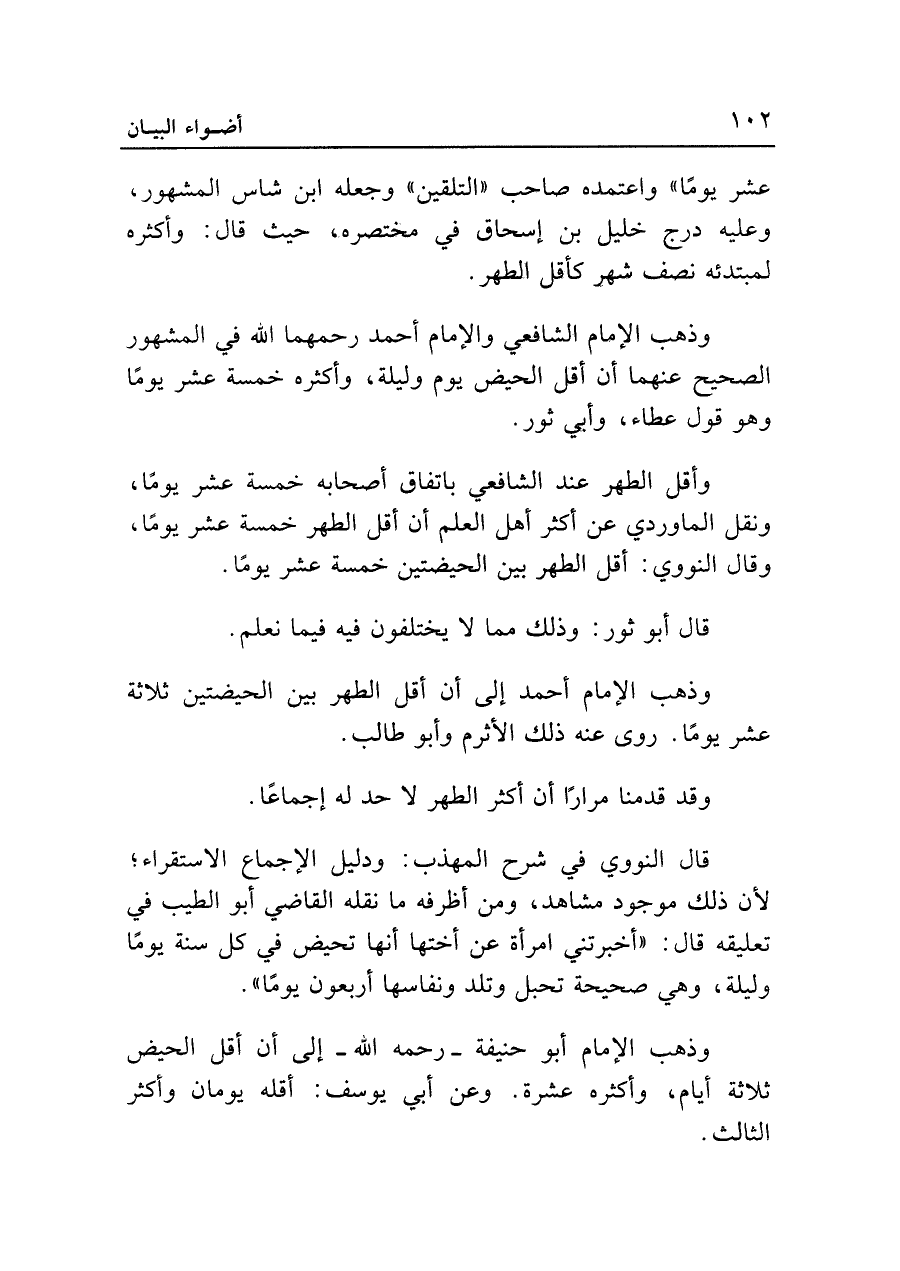 وذهب الإمام الشافعي والإمام أحمد رحمهما الله في المشهور الصحيح عنهما أن أقل الحيض يوم وليلة، وأكثره خمسة عشر يومًا وهو قول عطاء، وأبي ثور.