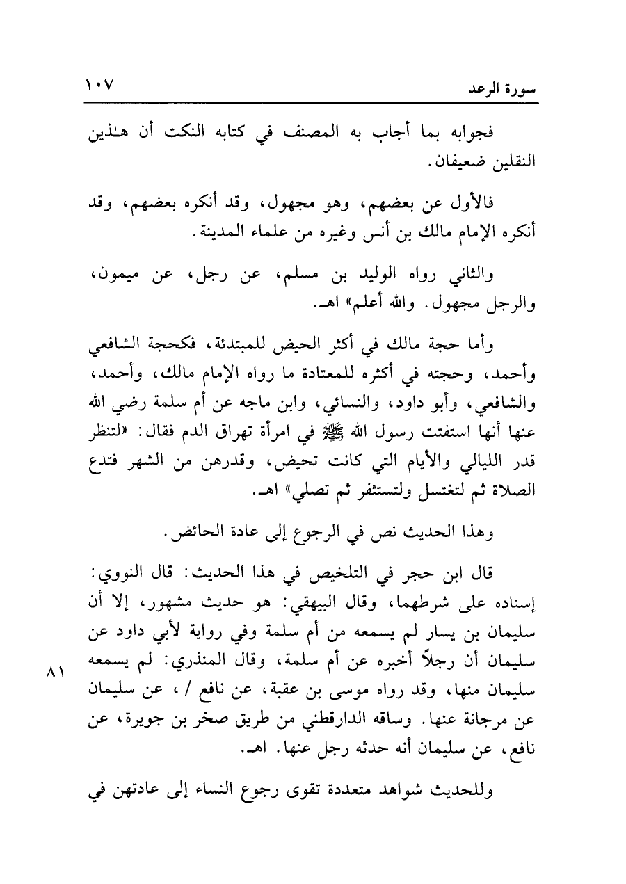 قال ابن حجر في التلخيص في هذا الحديث: قال النووي: إسناده على شرطهما، وقال البيهقي: هو حديث مشهور، إلا أن سليمان بن يسار لم يسمعه من أم سلمة وفي رواية لأبي داود عن سليمان أن رجلًا أخبره عن أم سلمة، وقال المنذري: لم يسمعه سليمان منها، وقد رواه موسى بن عقبة، عن نافع، عن سليمان عن مرجانة عنها. وساقه الدارقطني من طريق صخر بن جويرة، عن نافع، عن سليمان أنه حدثه رجل عنها. اه.