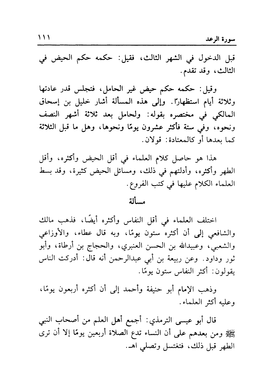 قال أبو عيسى الترمذي: أجمع أهل العلم من أصحاب النبي - صلى الله عليه وسلم - ومن بعدهم على أن النساء تدع الصلاة أربعين يومًا إلا أن ترى الطهر قبل ذلك، فتغتسل وتصلي اه.