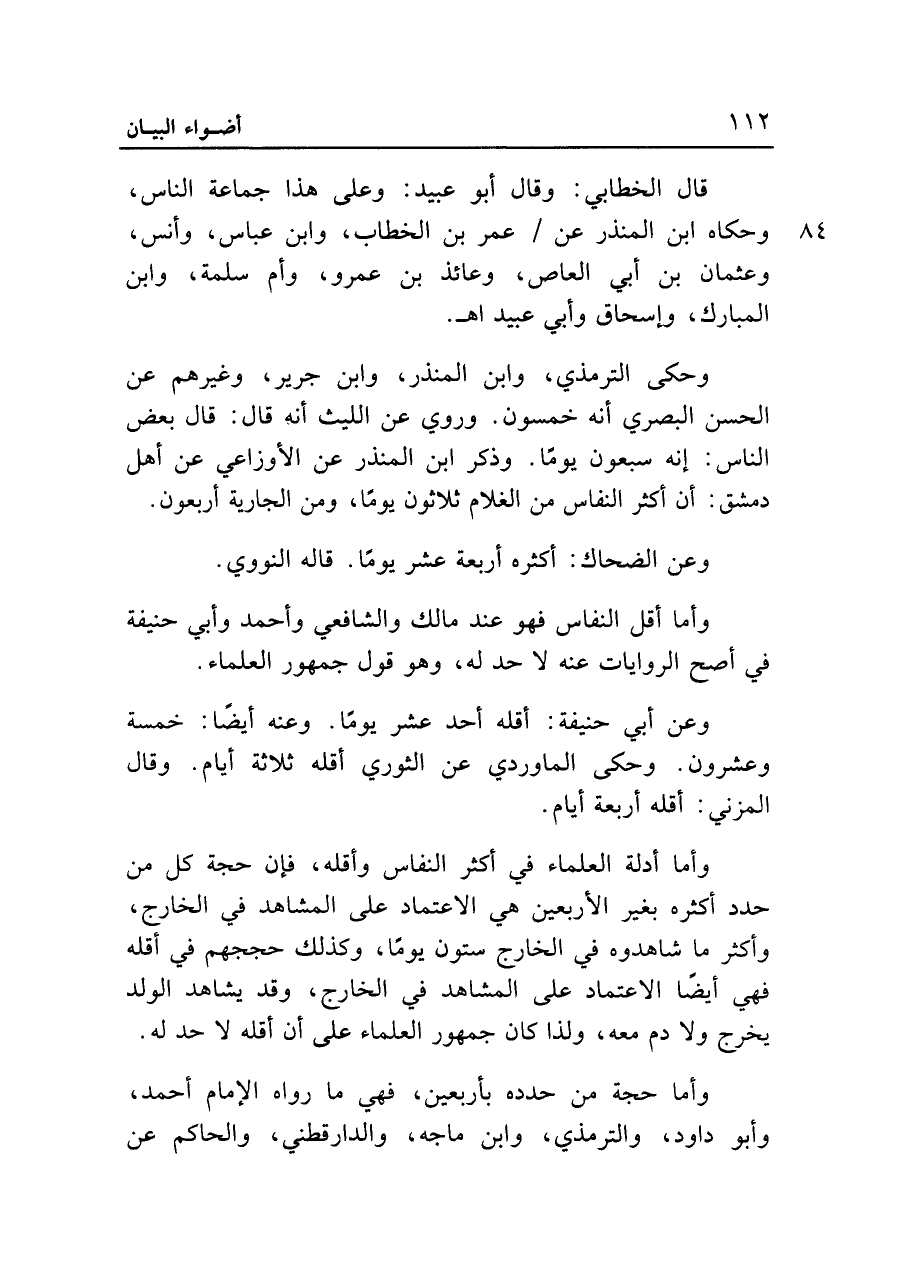 وأما أدلة العلماء في أكثر النفاس وأقله، فإن حجة كل من حدد أكثره بغير الأربعين هي الاعتماد على المشاهد في الخارج، وأكثر ما شاهدوه في الخارج ستون يومًا، وكذلك حججهم في أقله فهي أيضًا الاعتماد على المشاهد في الخارج، وقد يشاهد الولد يخرج ولا دم معه، ولذا كان جمهور العلماء على أن أقله لا حد له.
