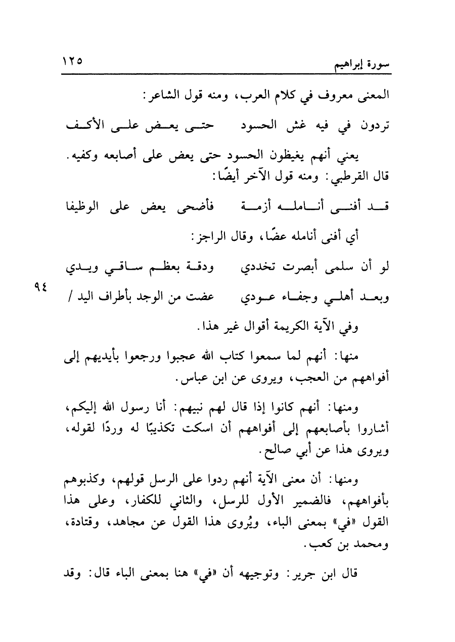 ومنها: أن معنى الآية أنهم ردوا على الرسل قولهم، وكذبوهم بأفواههم، فالضمير الأول للرسل، والثاني للكفار، وعلى هذا القول "في" بمعنى الباء، ويُروى هذا القول عن مجاهد، وقَتَادة، ومحمد بنُ كعب.