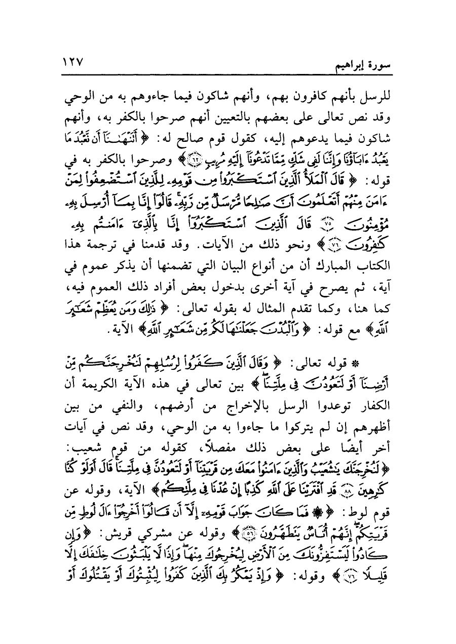 • قوله تعالى: {وَقَالَ الَّذِينَ كَفَرُوا لِرُسُلِهِمْ لَنُخْرِجَنَّكُمْ مِنْ أَرْضِنَا أَوْ لَتَعُودُنَّ فِي مِلَّتِنَا} بين تعالى في هذه الآية الكريمة أن الكفار توعدوا الرسل بالإخراج من أرضهم، والنفي من بين أظهرهم إن لم يتركوا ما جاءوا به من الوحي، وقد نص في آيات أخر أيضًا على بعض ذلك مفصلًا، كقوله من قوم شعيب: {لَنُخْرِجَنَّكَ يَاشُعَيْبُ وَالَّذِينَ آمَنُوا مَعَكَ مِنْ قَرْيَتِنَا أَوْ لَتَعُودُنَّ فِي مِلَّتِنَا قَالَ أَوَلَوْ كُنَّا كَارِهِينَ (٨٨) قَدِ افْتَرَيْنَا عَلَى اللَّهِ كَذِبًا إِنْ عُدْنَا فِي مِلَّتِكُمْ} الآية، وقوله عن قوم لوط: {فَمَا كَانَ جَوَابَ قَوْمِهِ إِلَّا أَنْ قَالُوا أَخْرِجُوا آلَ لُوطٍ مِنْ قَرْيَتِكُمْ إِنَّهُمْ أُنَاسٌ يَتَطَهَّرُونَ (٥٦)} وقوله عن مشركي قريش: {وَإِنْ كَادُوا لَيَسْتَفِزُّونَكَ مِنَ الْأَرْضِ لِيُخْرِجُوكَ مِنْهَا وَإِذًا لَا يَلْبَثُونَ خِلَافَكَ إِلَّا قَلِيلًا (٧٦)} وقوله: {وَإِذْ يَمْكُرُ بِكَ الَّذِينَ كَفَرُوا لِيُثْبِتُوكَ أَوْ يَقْتُلُوكَ أَوْ