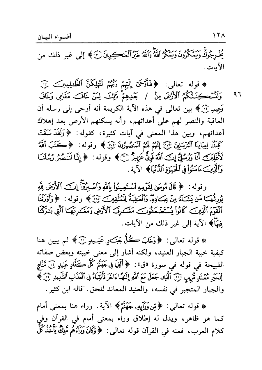 • قوله تعالى: {فَأَوْحَى إِلَيْهِمْ رَبُّهُمْ لَنُهْلِكَنَّ الظَّالِمِينَ (١٣) وَلَنُسْكِنَنَّكُمُ الْأَرْضَ مِنْ بَعْدِهِمْ ذَلِكَ لِمَنْ خَافَ مَقَامِي وَخَافَ وَعِيدِ (١٤)} بين تعالى في هذه الآية الكريمة أنَّه أوحى إلى رسله أن العاقبة والنصر لهم على أعدائهم، وأنه يسكنهم الأرض بعد إهلاك أعدائهم، وبين هذا المعنى في آيات كثيرة، كقوله: {وَلَقَدْ سَبَقَتْ كَلِمَتُنَا لِعِبَادِنَا الْمُرْسَلِينَ (١٧١) إِنَّهُمْ لَهُمُ الْمَنْصُورُونَ (١٧٢)} وقوله: {كَتَبَ اللَّهُ لَأَغْلِبَنَّ أَنَا وَرُسُلِي إِنَّ اللَّهَ قَوِيٌّ عَزِيزٌ (٢١)} وقوله: {إِنَّا لَنَنْصُرُ رُسُلَنَا وَالَّذِينَ آمَنُوا فِي الْحَيَاةِ الدُّنْيَا} الآية.