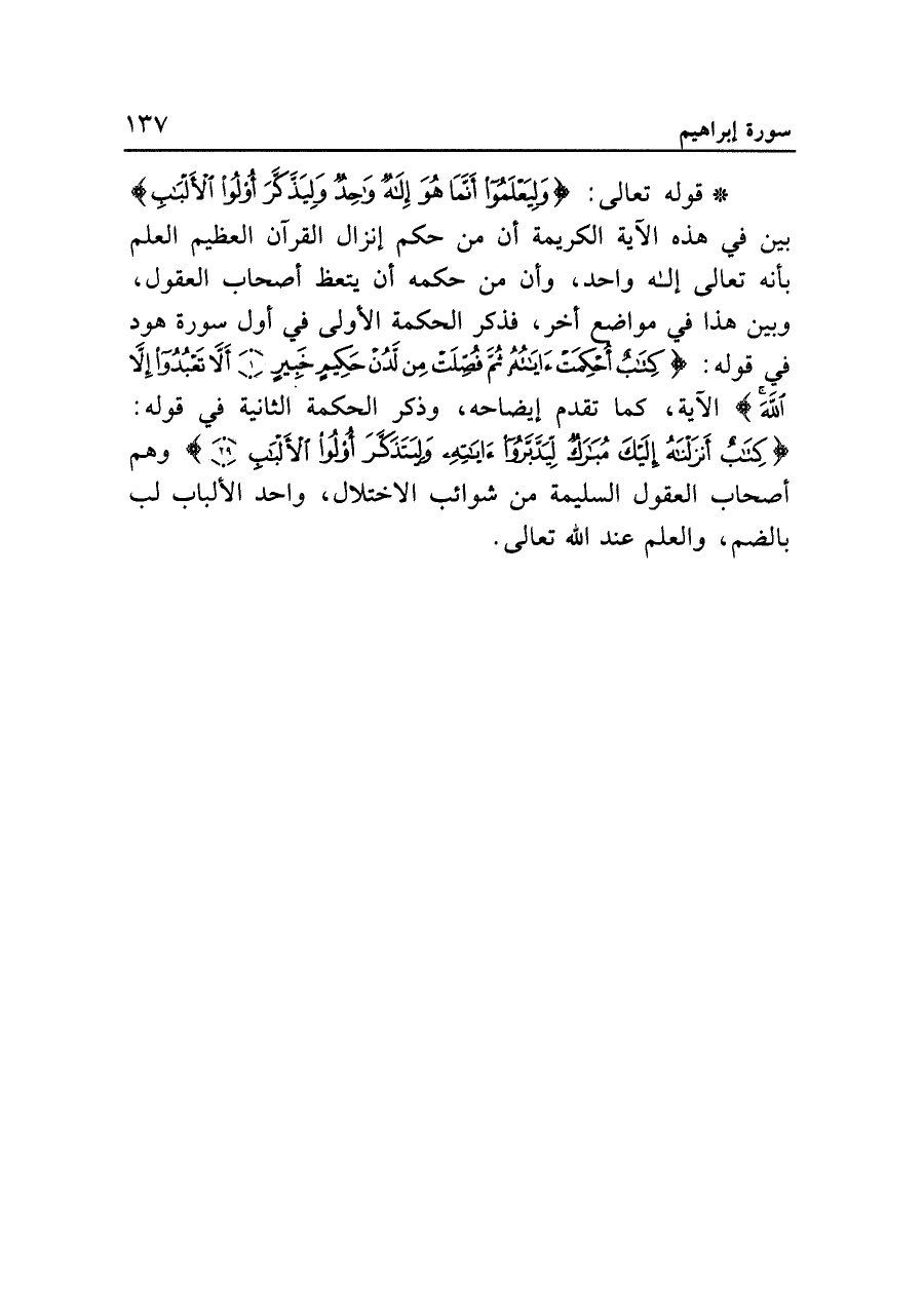 • قوله تعالى: {وَلِيَعْلَمُوا أَنَّمَا هُوَ إِلَهٌ وَاحِدٌ وَلِيَذَّكَّرَ أُولُو الْأَلْبَابِ} بين في هذه الآية الكريمة أن من حكم إنزال القرآن العظيم العلم بأنه تعالى إله واحد، وأن من حكمه أن يتعظ أصحاب العقول، وبين هذا في مواضع أخر، فذكر الحكمة الأولى في أول سورة هود في قوله: {كِتَابٌ أُحْكِمَتْ آيَاتُهُ ثُمَّ فُصِّلَتْ مِنْ لَدُنْ حَكِيمٍ خَبِيرٍ (١) أَلَّا تَعْبُدُوا إِلَّا اللَّهَ} الآية، كما تقدم إيضاحه، وذكر الحكمة الثانية في قوله: {كِتَابٌ أَنْزَلْنَاهُ إِلَيْكَ مُبَارَكٌ لِيَدَّبَّرُوا آيَاتِهِ وَلِيَتَذَكَّرَ أُولُو الْأَلْبَابِ (٢٩)} وهم أصحاب العقول السليمة من شوائب الاختلال، واحد الألباب لب بالضم، والعلم عند الله تعالى.