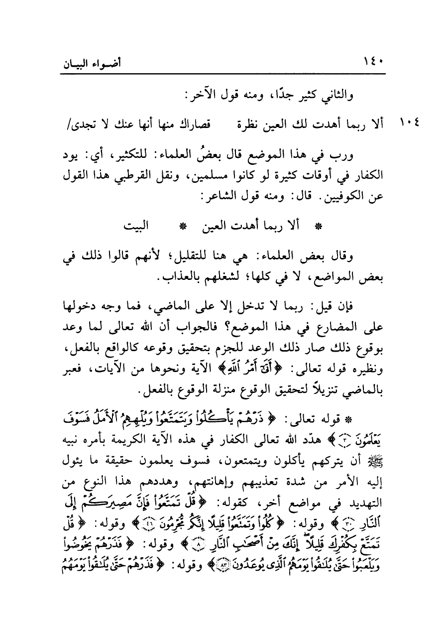 • قوله تعالى: {ذَرْهُمْ يَأْكُلُوا وَيَتَمَتَّعُوا وَيُلْهِهِمُ الْأَمَلُ فَسَوْفَ يَعْلَمُونَ (٣)} هدّد الله تعالى الكفار في هذه الآية الكريمة بأمره نبيه - صلى الله عليه وسلم - أن يتركهم يأكلون ويتمتعون، فسوف يعلمون حقيقة ما يئول إليه الأمر من شدة تعذيبهم وإهانتهم، وهددهم هذا النوع من التهديد في مواضع أخر، كقوله: {قُلْ تَمَتَّعُوا فَإِنَّ مَصِيرَكُمْ إِلَى النَّارِ (٣٠)} وقوله: {كُلُوا وَتَمَتَّعُوا قَلِيلًا إِنَّكُمْ مُجْرِمُونَ (٤٦)} وقوله: {قُلْ تَمَتَّعْ بِكُفْرِكَ قَلِيلًا إِنَّكَ مِنْ أَصْحَابِ النَّارِ (٨)} وقوله: {فَذَرْهُمْ يَخُوضُوا وَيَلْعَبُوا حَتَّى يُلَاقُوا يَوْمَهُمُ الَّذِي يُوعَدُونَ (٨٣)} وقوله: {فَذَرْهُمْ حَتَّى يُلَاقُوا يَوْمَهُمُ
