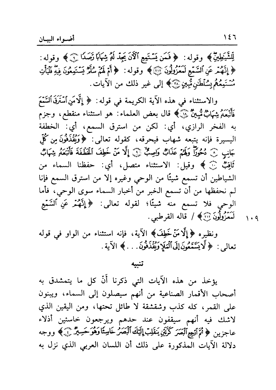 والاستثناء في هذه الآية الكريمة في قوله: {إِلَّا مَنِ اسْتَرَقَ السَّمْعَ فَأَتْبَعَهُ شِهَابٌ مُبِينٌ (١٨)} قال بعض العلماء: هو استثناء منقطع، وجزم به الفخر الرازي، أي: لكن من استرق السمع، أي: الخطفة اليسيرة فإنه يتبعه شهاب فيحرقه، كقوله تعالى: {وَيُقْذَفُونَ مِنْ كُلِّ جَانِبٍ (٨) دُحُورًا وَلَهُمْ عَذَابٌ وَاصِبٌ (٩) إِلَّا مَنْ خَطِفَ الْخَطْفَةَ فَأَتْبَعَهُ شِهَابٌ ثَاقِبٌ (١٠)} وقيل: الاستثناء متصل، أي: حفظنا السماء من الشياطين أن تسمع شيئًا من الوحي وغيره إلَّا من استرق السمع فإنا لم نحفظها من أن تسمع الخبر من أخبار السماء سوى الوحي، فأما الوحي فلا تسمع منه شيئًا؛ لقوله تعالى: {إِنَّهُمْ عَنِ السَّمْعِ لَمَعْزُولُونَ (٢١٢)} قاله القرطبي.