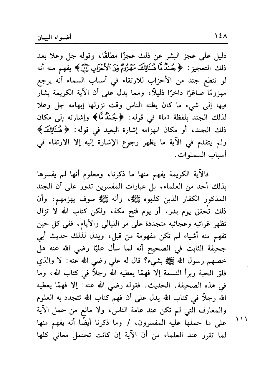 دليل على عجز البشر عن ذلك عجزا مطلقًا، وقوله جل وعلا بعد ذلك التعجيز: {جُنْدٌ مَا هُنَالِكَ مَهْزُومٌ مِنَ الْأَحْزَابِ (١١)} يفهم منه أنَّه لو تنطع جند من الأحزاب للارتقاء في أسباب السماء أنَّه يرجع مهزومًا صاغرًا داخرًا ذليلًا، ومما يدل على أن الآية الكريمة يشار فيها إلى شيء ما كان يظنه الناس وقت نزولها إبهامه جل وعلا لذلك الجند بلفظة "ما" في قوله: {جُنْدٌ مَا} وإشارته إلى مكان ذلك الجند، أو مكان انهزامه إشارة البعيد فى قوله: {هُنَالِكَ} ولم يتقدم في الآية ما يظهر رجوع الإشارة إليه إلَّا الارتقاء في أسباب السموات.
